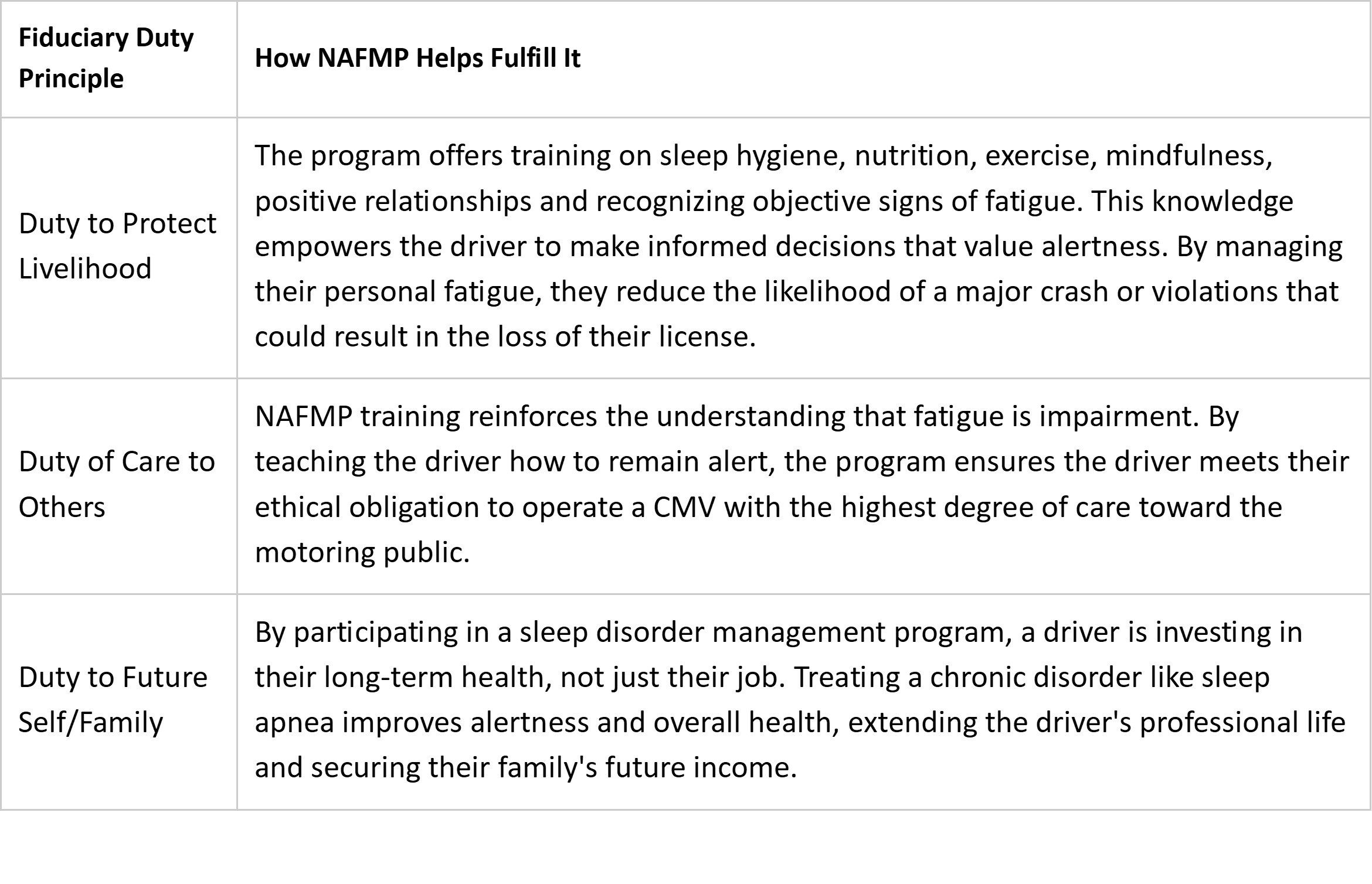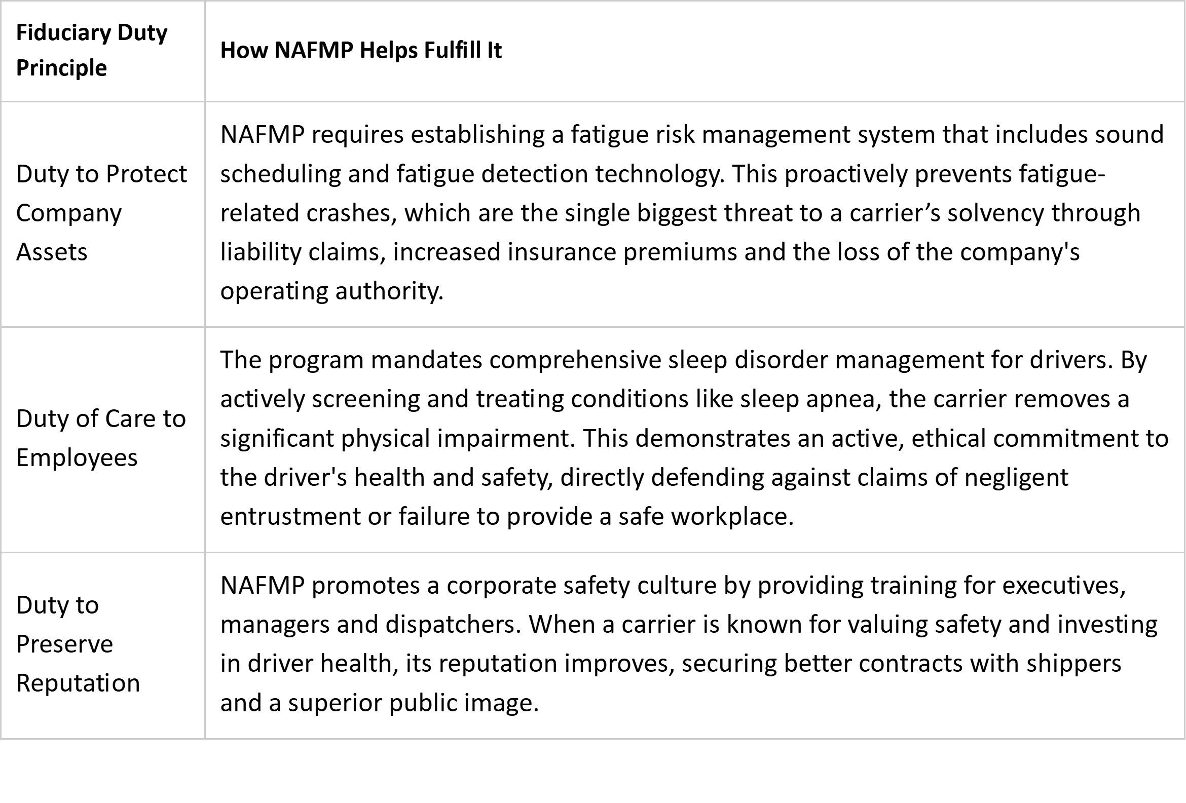 Implementing a fatigue management program in accordance with the recommendations of the North American Fatigue Management Program (NAFMP) is one of the most direct and effective ways for both professional drivers and motor carriers to fulfill their fiduciary duties.