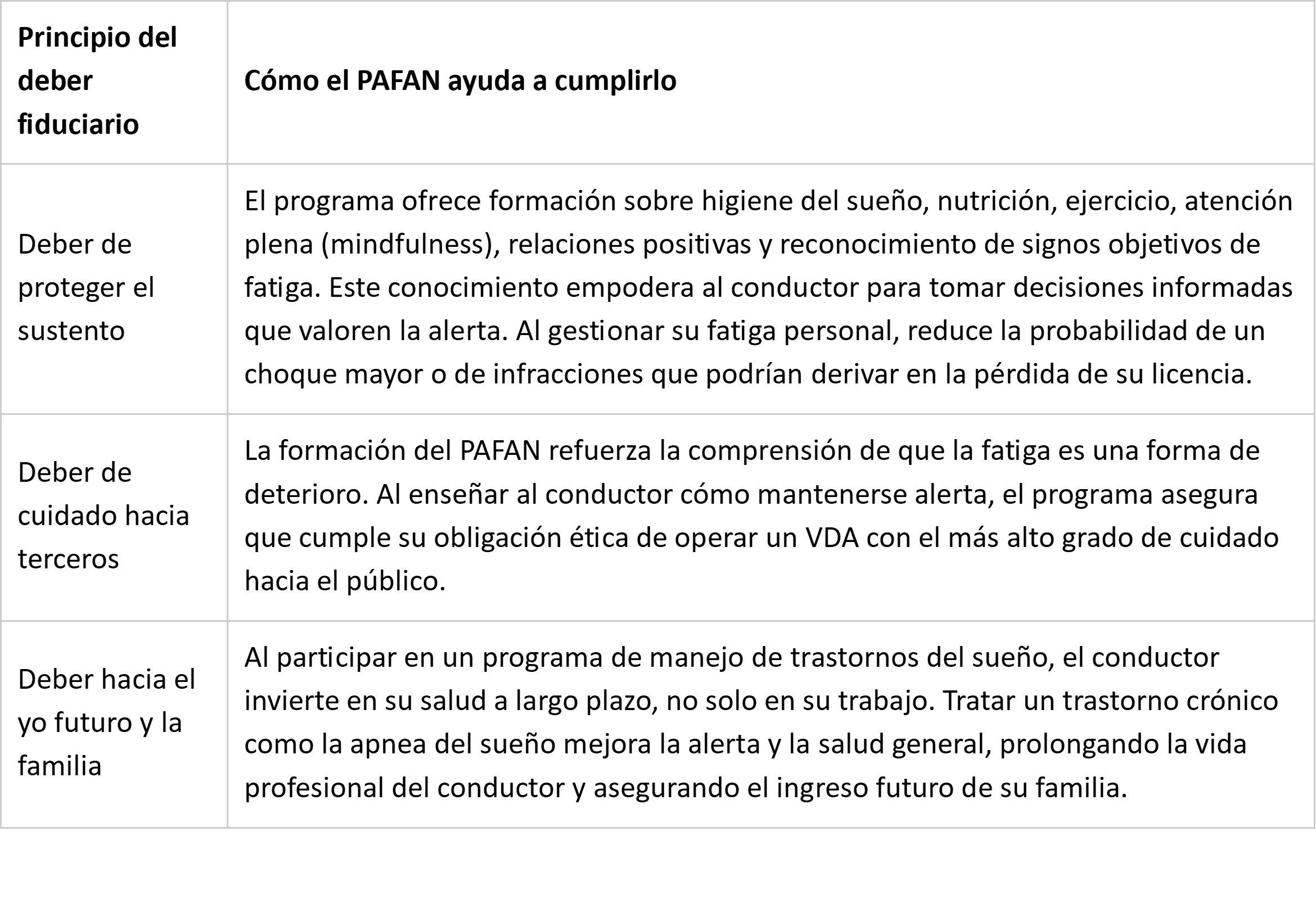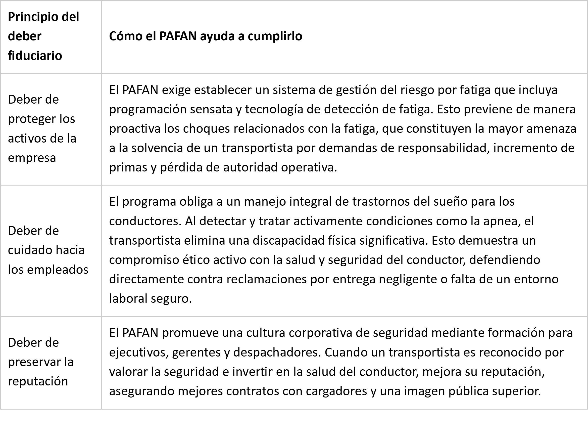 Implementar un programa de gestión de la fatiga conforme a las recomendaciones del Programa de Administración de la Fatiga de America del Norte (PAFAN)es una de las vías más directas y efectivas para que conductores profesionales y transportistas cumplan con sus deberes fiduciarios. El PAFAN desplaza el foco de la mera conformidad con las HOS a la gestión proactiva del riesgo de fatiga, protegiendo directamente los activos críticos de todas las partes.